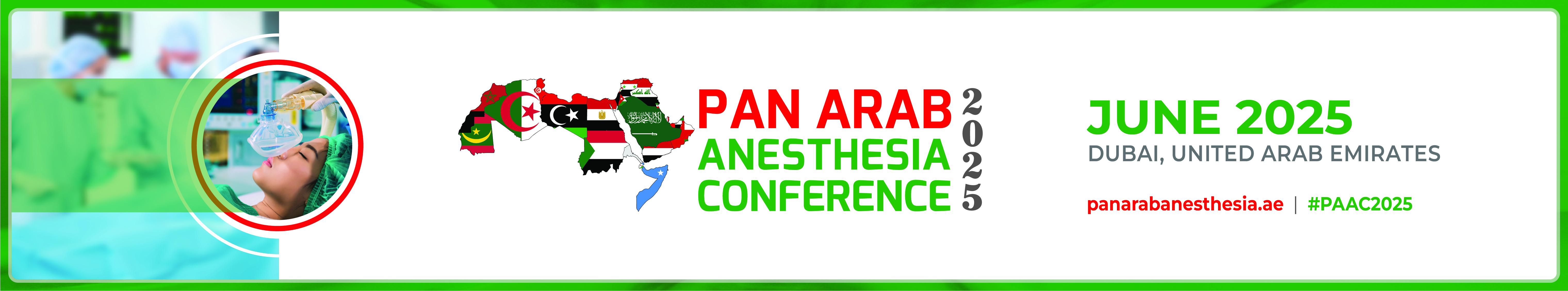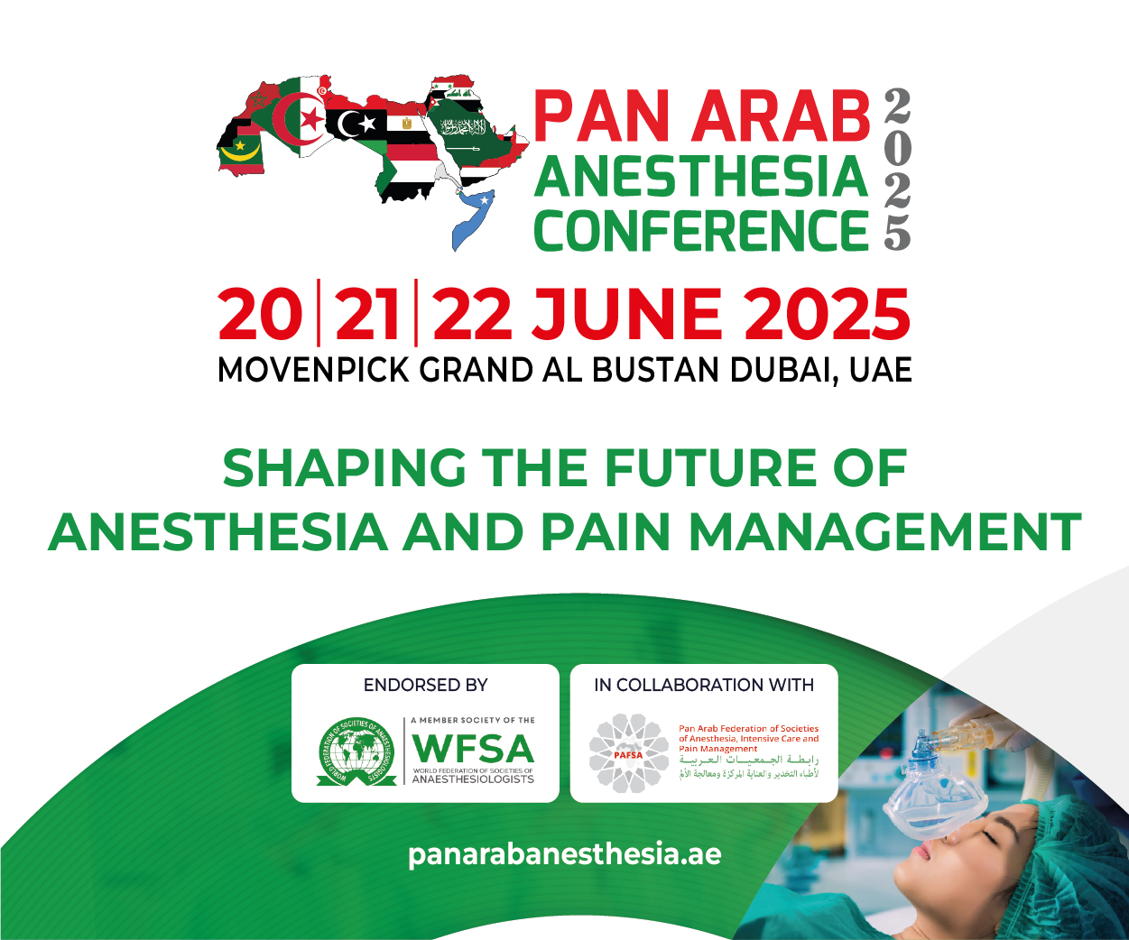 The Pan Arab Anesthesia Conference 2025 is set to take place on 20, 21 & 22 June 2025 in Movenpick Grand Al Bustan, Dubai, UAE. Pan Arab Anesthesia Conference is a major regional event that brings together anesthesiologists, intensivists, pain specialists, and other healthcare professionals involved in anesthesia and critical care from across the Arab world and beyond. The conference serves as a platform for knowledge exchange, professional development, and collaboration in the fields of anesthesia, pain management, and critical care medicine.